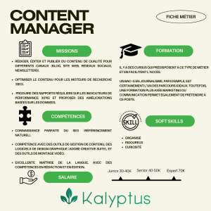 Le Content Manager est chargé de valoriser l’image d’une entreprise via son contenu numérique. Ce poste se situe entre le Community Manager et le Rédacteur Web. Il conçoit la stratégie éditoriale numérique. Le Content Manager est aussi auteur de ces contenus et gère leurs publications. En termes de contenus, il peut être amené à concevoir des vidéos et des visuels. Sa fonction comporte des responsabilités, notamment dans la publication. En effet, certains contenus peuvent créer une polémique, ce à quoi le Content Manager doit en assumer la responsabilité. Pour mener à bien ces missions, il veille à optimiser le SEO (référencement naturel) avec des outils d’analyse web. Par ailleurs, le Content Manager est souvent à la tête d’une équipe de rédacteurs web qu’il doit manager pour suivre son planning de publication défini en amont.